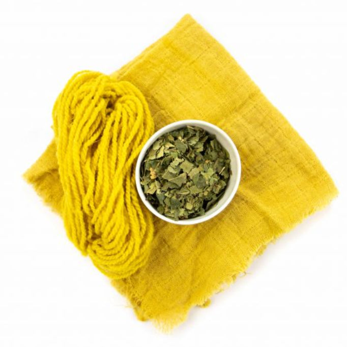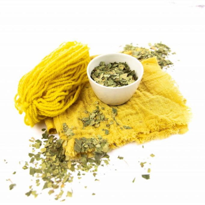 Birch leaves are collected in spring and dried in the dark. They come from the two birch species Betula alba and Betula pendula from the family Betulaceae. These birch species are native to northern Europe and the temperate latitudes of Asia and grow mostly in deciduous forests, meadows and bogs. Birch leaves contain the flavonoids hyperoside and a myricetin galactoside as coloring ingredients. It also contains about 3 to 5% tannins. The colors that can be obtained range from golden yellow to olive green. Wool pre-stained with alum becomes a beautiful bright yellow, if the material is treated with iron or copper sulfate, the tone changes to olive when exposed to air.