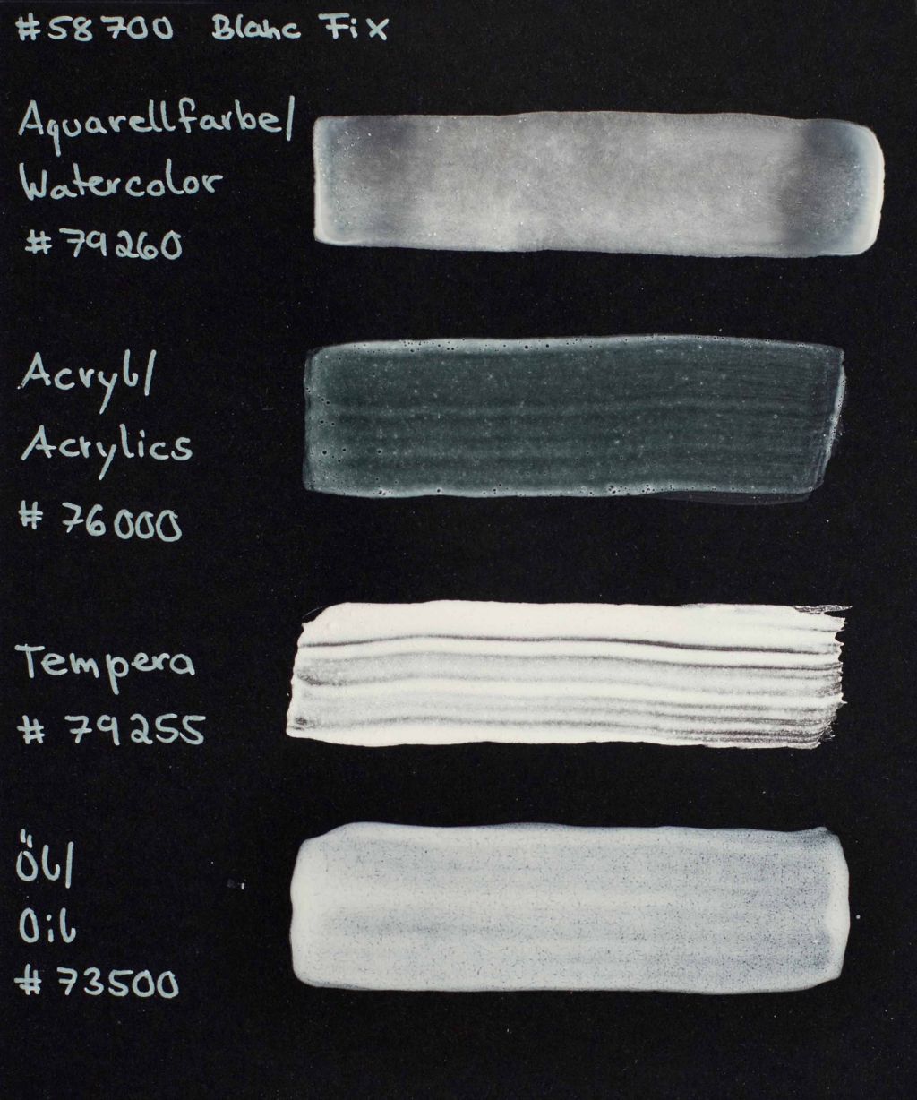 For heavy opaque colors, lowers oil absorption. Synthetic barium sulfate is the white pigment with the best reflectance for visible light (the reflectance of barite reaches nearly 100% without or almost without binder) and is therefore also used as a white standard in metrology. Barium sulfate is a very good inert blending agent for very strong pigments such as milori blue or chrome oxide green or a carrier substrate for colored paints. The heavy, pure white powder covers very little in aqueous binders and moderately in oil. It is also suitable for acrylics, ceramics, tempera and water glass.