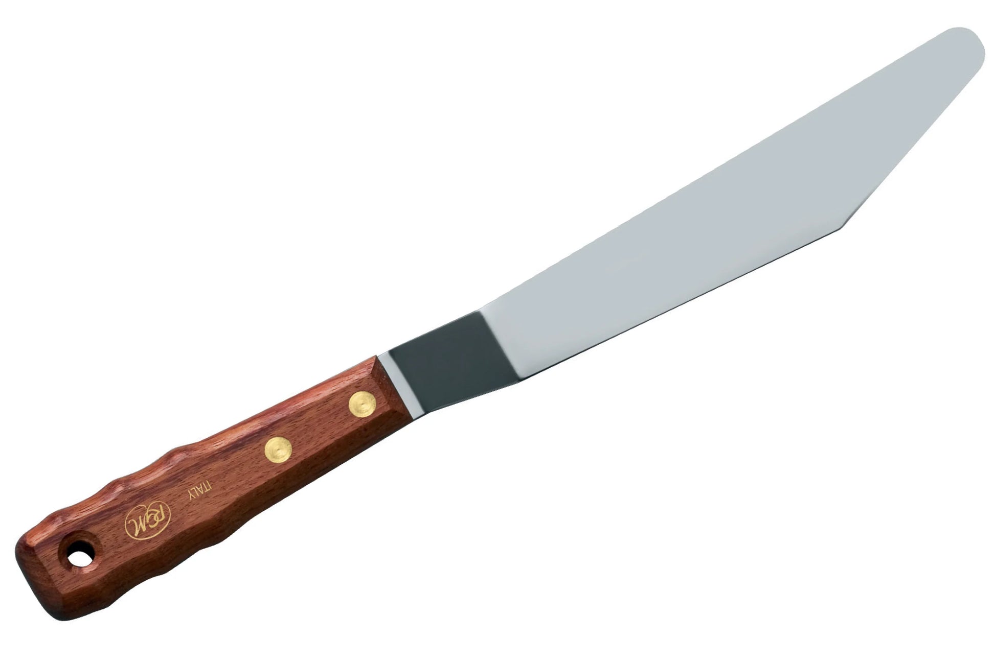New Generation XL Palette Knives are technical tools for moving stiff ink and paint, especially in professional and industrial environments. These large, Italian-made knives have ergonomic hardwood handles, brass fittings, and electroplated steel blades that release color easily.